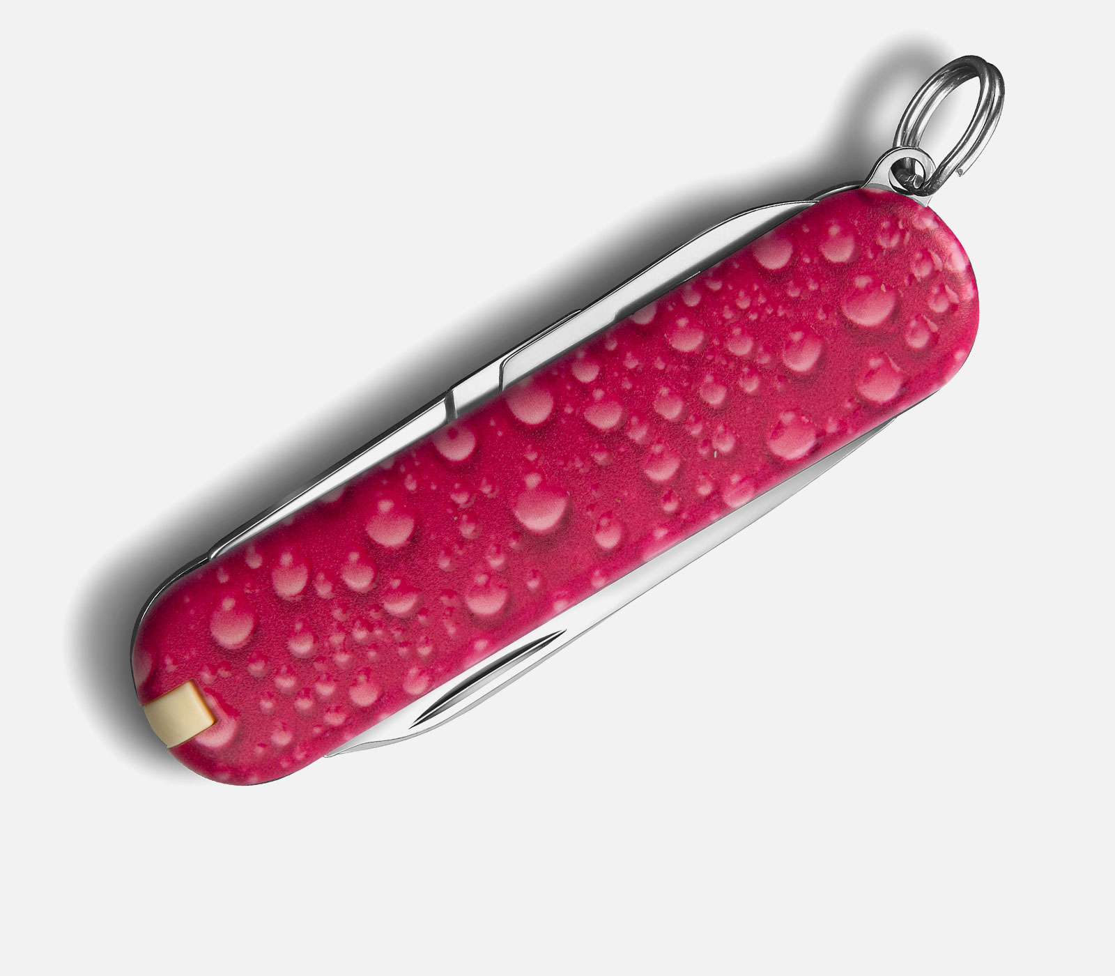 Das Sackmesser Classic Nature Bubbles pink wurde mit einer speziellen Struktur auf der Schale behandelt. Diese ist mit der Hand fühlbar. Es gehört daher zu den "Touch & Feel" Taschenmessern und ist mit seinen verschiedenen Farbvarianten bei uns im Laden sehr beliebt. Der 3D-Druck, welcher die Oberfläche wie Wassertropfen erscheinen lässt, gab dem Messer den speziellen Namen "Bubbles".