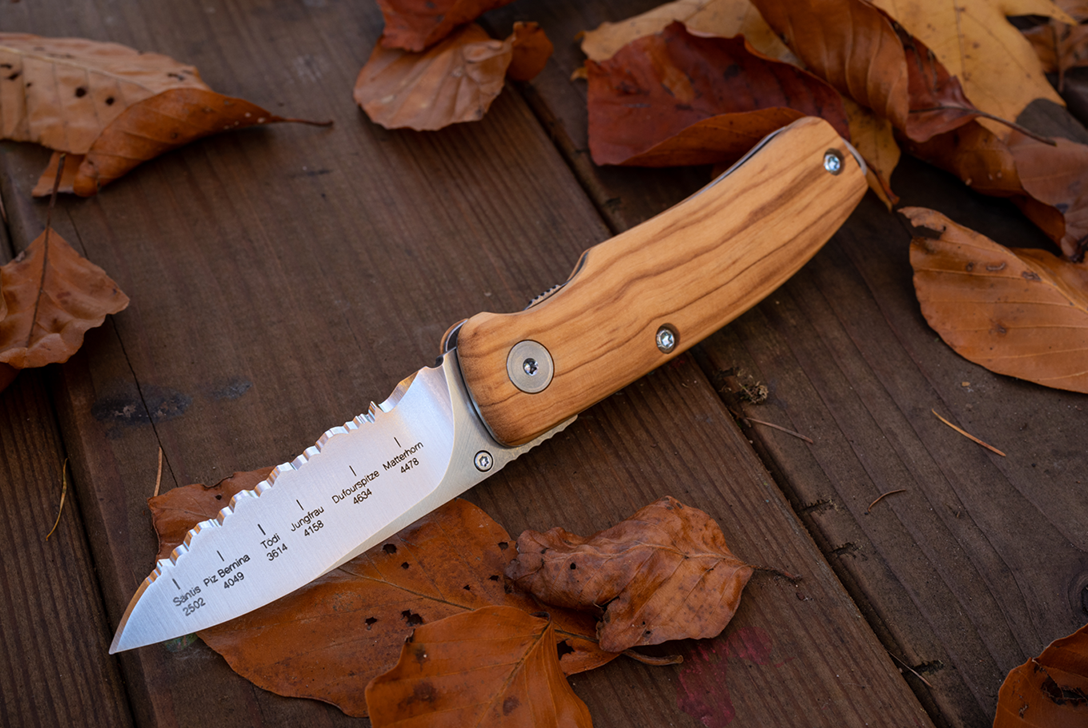Das Klappmesser Maloja Olive der Firma PanoramaKnife gehört zur Ausrüstung jedes Abenteurer, wenn er auf dem Weg in die raue Natur ist. Es wird am Fusse des Maloja-Passes in Vicosoprano in einem traditionellen Verfahren gefertigt. Die Klinge besteht aus dem hochwertigen Böhlerstahl N690, welchem Ultrahärte und Ultraschärfe nachgesagt wird. Daneben bildet es, typisch für PanoramaKnife, die Berge der Schweiz ab, in diesem Fall die Best of Switzerland. Der Liner-Lock läst die Klinge einrasten und sorgt damit für die erforderliche Sicherheit im Umgang mit dem Messer. Um auch der optischen Komponente Folge zu tragen, erhält das Klappmesser Maloja Olive einen passenden Abenteurerlook aus witterungsfestem Olivenholz, einem der härtesten Hölzer Europas.